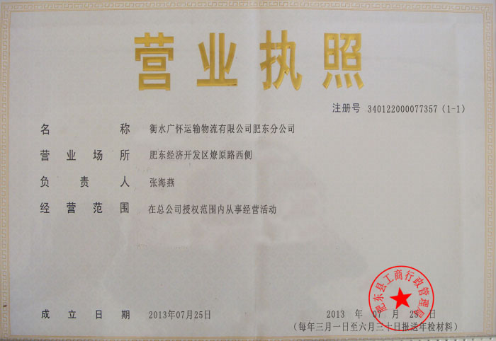 衡水广怀运输物流有限公司肥东分公司营业执照(副本)